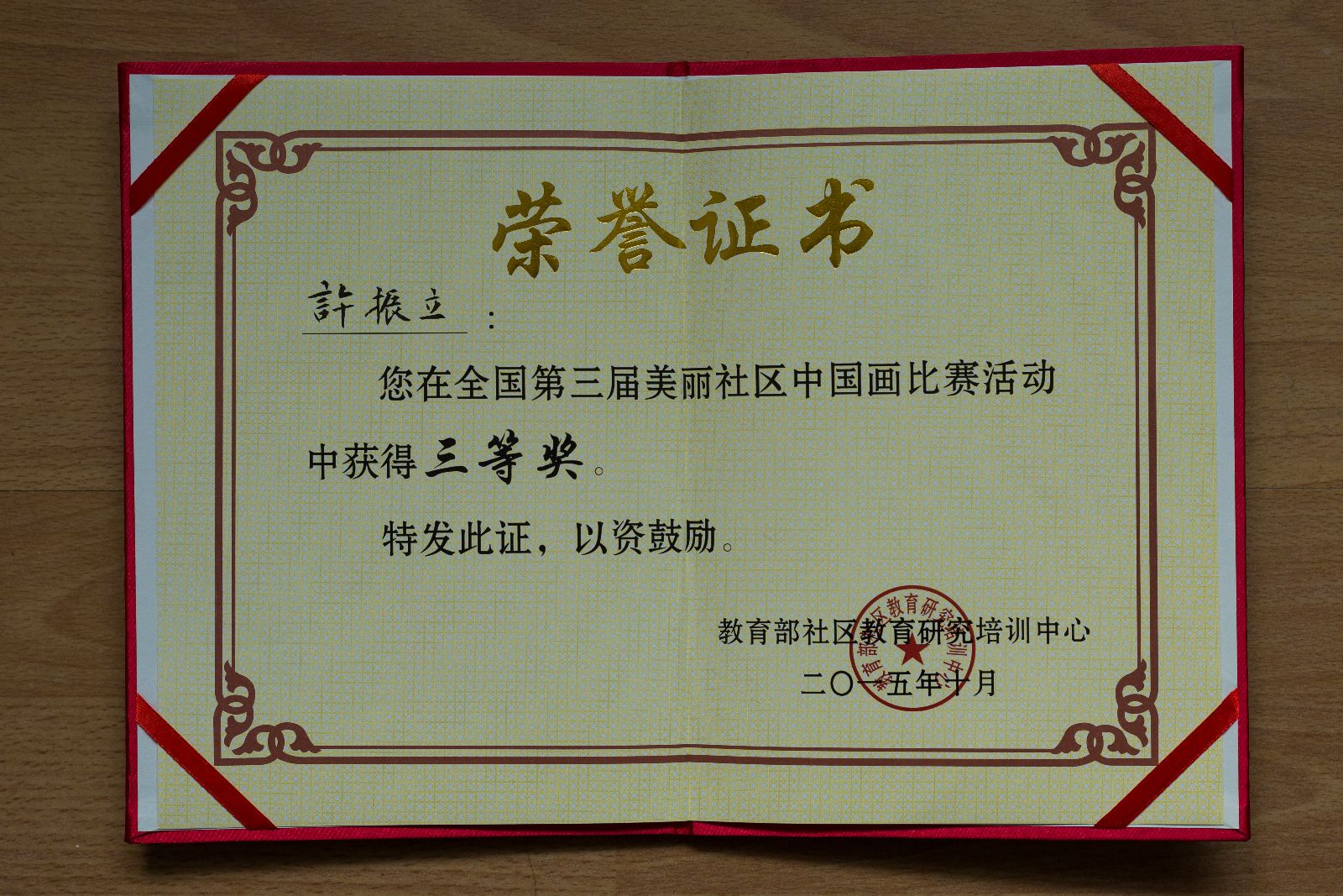 (社区教育办公室 报道)日前,在教育部社区教育研究培训中心举办的全国“美丽社区中国画比赛”中,我校积极参与,广泛宣传,认真筹备,组织本校及各个社区多宝(中国)教师参赛。经过评审委员会评审,我校已退休老校长许振立获得了本次比赛的三等奖。今后,我校将继续开展社区教育活动,努力普及和弘扬中华传统文化,引导社区文化教育事业健康发展。