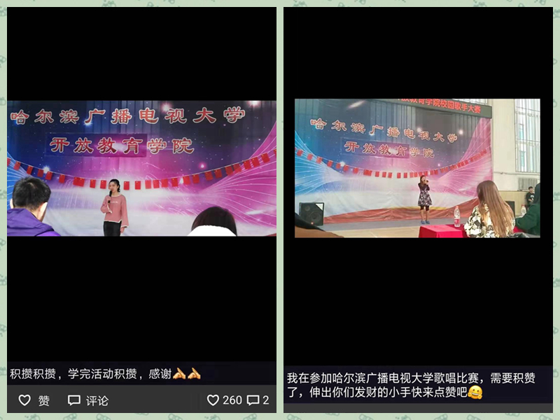 比赛结束后,同学们意犹未尽,为了让更多的朋友看到比赛的盛况、了解电大、熟悉自己的校园生活,同学们纷纷把当天活动的视频及照片转发到朋友圈中进行集赞。