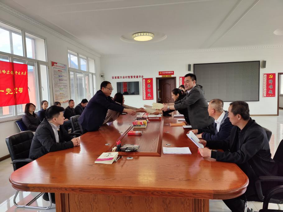 随后,共建双方全体党员干部在兴业村开展研讨座谈会,关龙艳副校长传达了习近平新时代中国特色社会主义思想主题教育工作会议上的讲话,全体党员干部结合工作实际情况开展讨论。讨论结束后,结合“五进工作,实现公益活动常态化”,助力于兴业村读书环境的改善,第一党支部向兴业村党支部捐献图书。