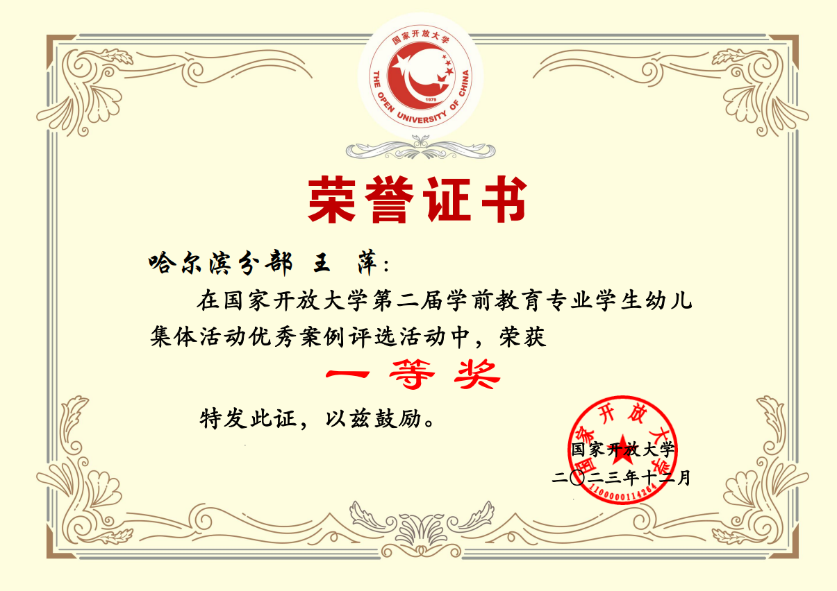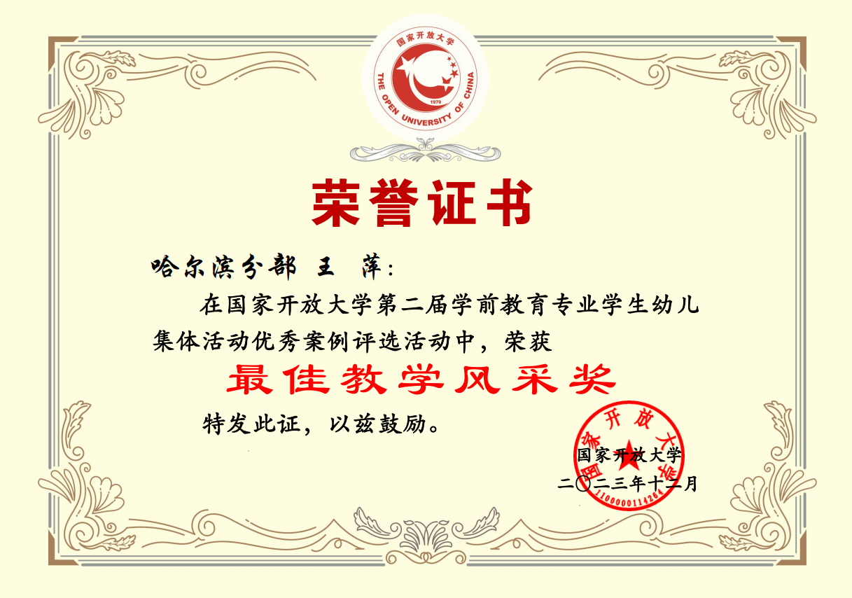 在刚刚结束的国家开放大学学前教育专业学生幼儿园优秀游戏活动中,我校王萍同学荣获“国家开放大学第二届学前教育专业学生幼儿集体活动优秀案例评选活动”一等奖和最佳教学风采奖。