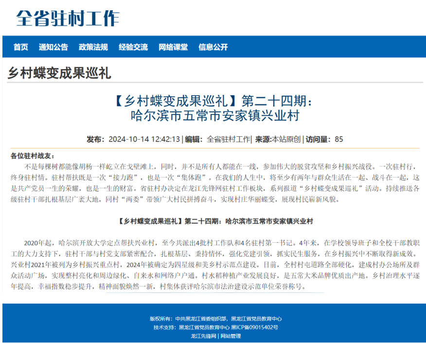 近日,哈尔滨开放大学驻村工作作为全省先进典型被龙江先锋网报道。