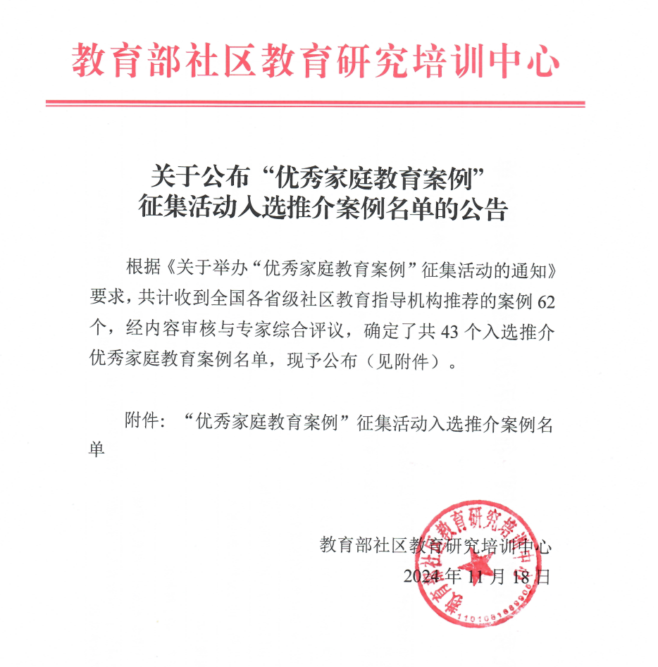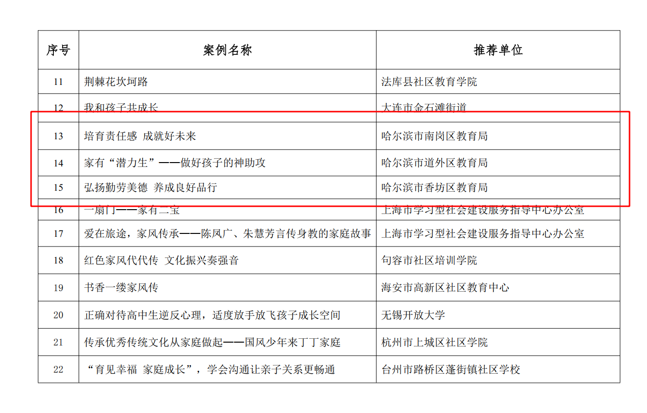 今年6月份我校(哈尔滨市社区教育指导中心)与市教育局、市妇联联合举办了“首届新时代家庭教育优秀案例征集活动”,围绕家庭家教家风建设设置9类主题,征集各区县(市)优秀案例32个,经专家评审一等奖优秀案例推荐参与教育部社区教育研究培训中心“优秀家庭教育案例”征集活动。11月18日,教育部社区教育研究培训中心公布了入选推介案例名单的公告,我市南岗区教育局、道外区教育局、香坊区教育局推荐的三个案例入选“优秀家庭教育案例”。