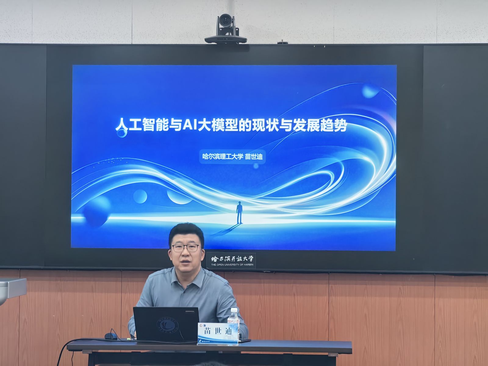启动仪式后,随即开展专题讲座,特邀哈尔滨理工大学苗世迪教授作《人工智能与AI大模型的现状与发展趋势》专题报告。苗教授从“技术演进、行业应用、伦理治理”等八大维度展开,系统剖析了AI大模型对高等教育的发展趋势。他提到,《人工智能教育白皮书》的发布标志着我国教育正式迈入AI深度赋能的新时代。该白皮书从“技术赋能、伦理治理、体系重构”三大维度,系统性规划了AI技术如何重塑基础教育、职业教育和高等教育的应用路径,为开放大学推进数智化教学改革提供了重要参考依据。