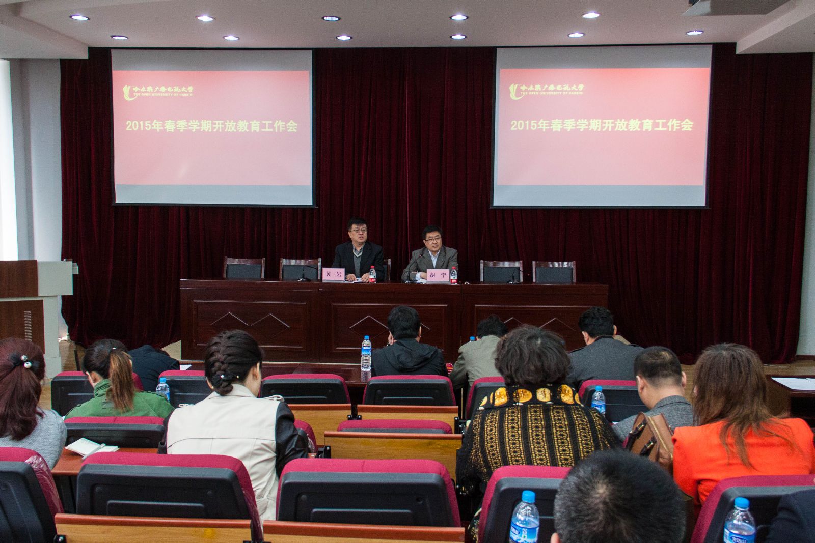 4月20日上午,2015年春季学期开放教育工作会在我校502多功能厅隆重召开。各分校、教学点负责人和招生、教务管理工作人员以及招生与系统建设办公室、教务处、开放教育学院科以上干部参加了会议,会议由副校长胡宁主持,校长黄岩参加了会议并做了重要讲话。