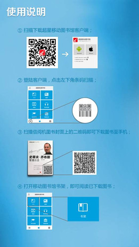 2. 超星移动图书馆客户端下载目前只支持安卓和苹果系统手机,可以使用手机在现场扫描二维码进行下载安装,也可以在安卓市场或者苹果APP STORE搜索、下载并安装超星移动图书馆客户端,再扫描哥德电子借阅机图书封面上的二维码即可下载图书到手机阅读。