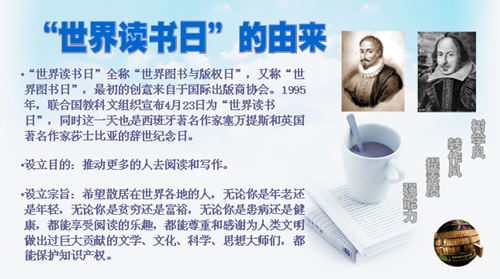 2015年4月23日,是联合国教科文组织确定的第20个“世界读书日”。1995年,联合国教科文组织宣布4月23日为“世界读书日”,旨在让各国政府与公众更加重视图书这一传播知识、表达观念和交流信息的形式。同时希望藉此鼓励世人尤其是年轻人去发现阅读的乐趣,增强对版权的保护意识,并对那些为促进人类的社会和文化进步做出不可替代贡献的人表示敬意。