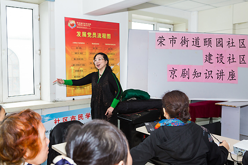 5月12日上午九点,我校艺术团团长徐丽君应邀来到荣市办事处为颐园社区多宝(中国)和建设社区多宝(中国)的学员举办京剧知识讲座。
