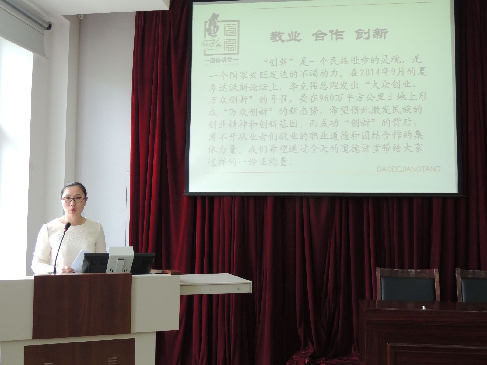 5月22日下午,多宝网页版登录入口“道德讲堂”在502教室举行。第三党支部以“敬业、合作、创新”为主题,讲堂通过“唱歌曲、学模范、诵经典、立自身、送吉祥”五个环节展开。校党委副书记马弘莉同志及全校教职工参加了本次活动。