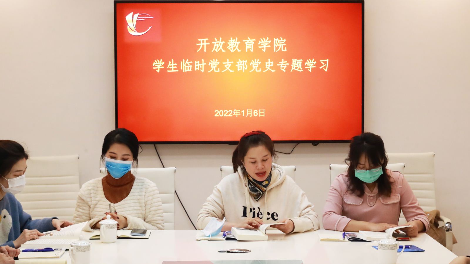 为将十九届六中全会精神更好的贯彻落实到学生工作中,充分发挥基层党组织战斗堡垒作用,提升学生凝聚力,积极引导广大学生学习党史、传承经典,深刻感悟和领会习近平新时代中国特色社会主义思想, 1月6日下午,开放教育学院学生临时党支部开展了党史学习教育读书交流会。会议由学生临时党支部书记、开放教育学院院长孙连娟同志主持,开放学院部分党员干部、辅导员和12名学生党员代表参加会议。