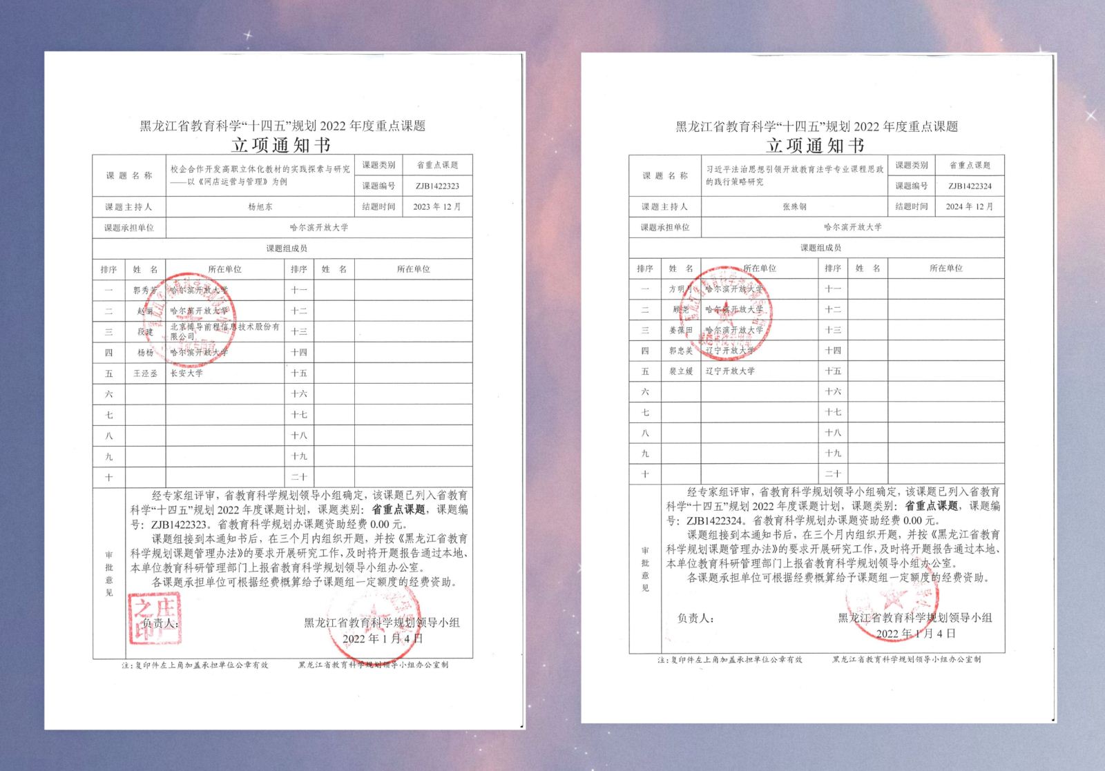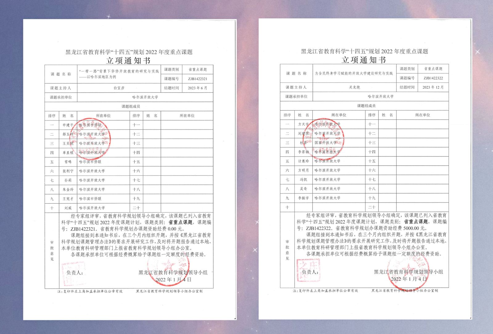 近日,黑龙江省教育科学规划办公布2022年度省重点课题名单,我校申报的4项课题准立项,其中1项课题获得经费资助。
