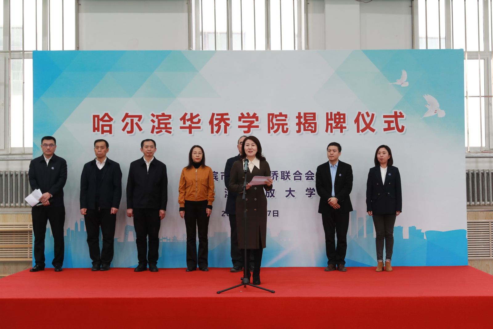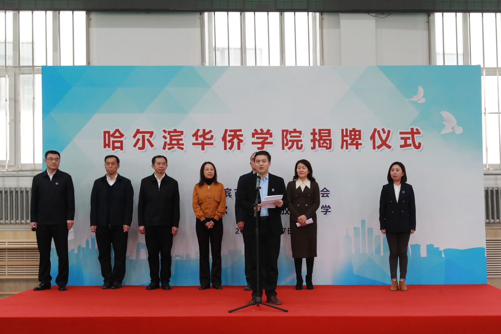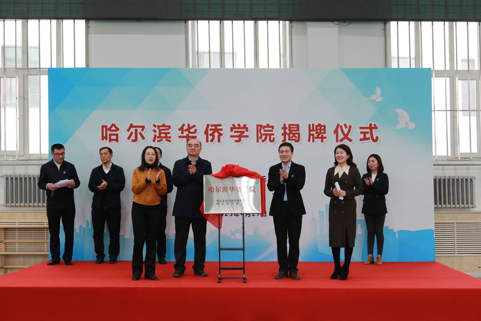 4月27日,哈尔滨华侨学院揭牌仪式在哈尔滨开放大学举行。省侨联党组书记、主席郭占力,市侨联党组书记、驻会主席申建平,哈尔滨开放大学党委书记刘建国,市委统战部副部长、市侨办主任孙晓梅,市侨联党组成员、秘书长杨为涛,哈尔滨开放大学副校长关龙艳,香港商报黑龙江办事处主任付彦华等出席仪式。哈尔滨开放大学纪委书记孙志国主持仪式。