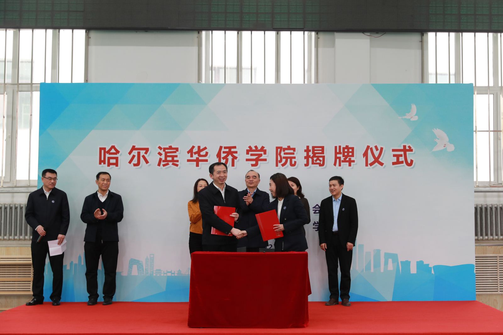 仪式上,郭占力、申建平、孙晓梅、刘建国等与会领导为哈尔滨华侨学院揭牌。杨为涛和副校长关龙艳作为双方代表签署了合作办学协议。
