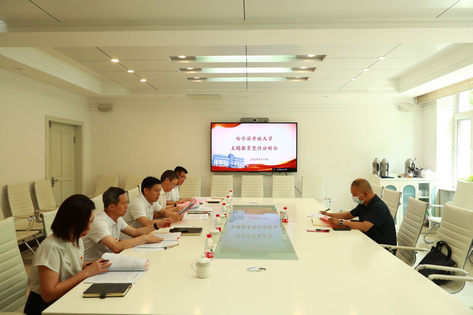为推动主题教育走深走实,促进学习教育成果入脑入心,6月19日,哈尔滨开放大学召开主题教育党性分析会议。党委书记刘建国主持会议,领导班子成员参加会议,市委主题教育第十五指导组吕刚同志到会指导。