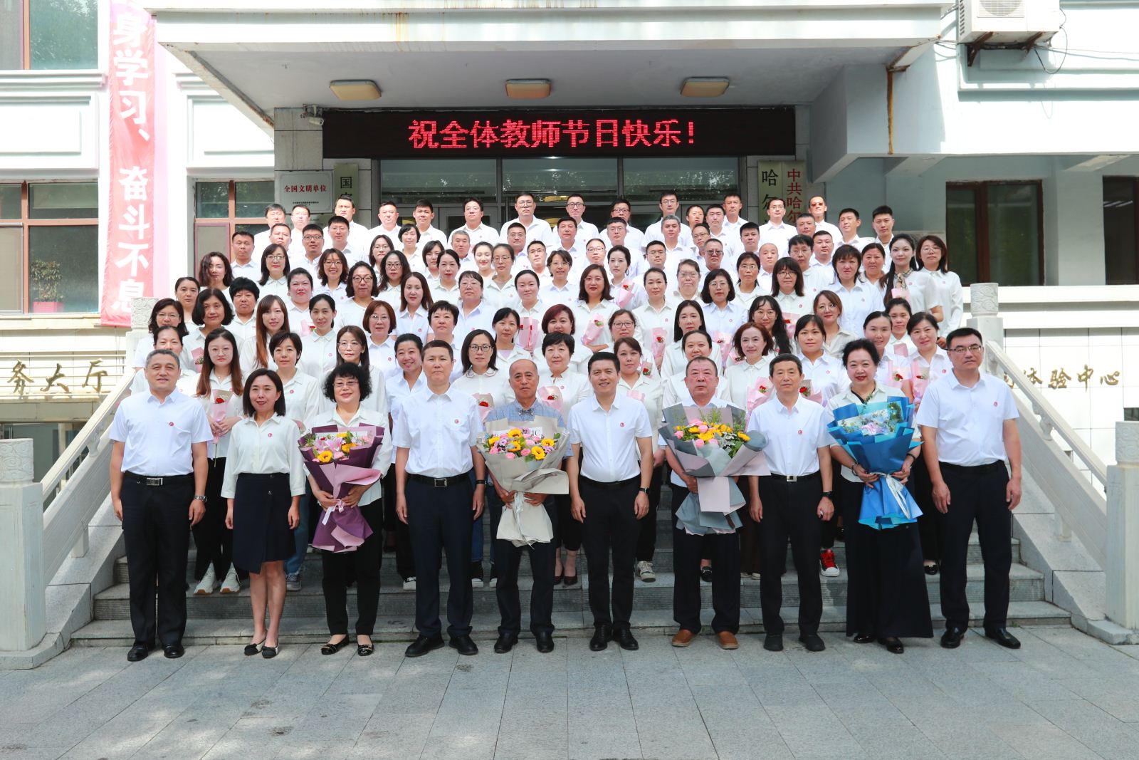 会后全体教职工在教学楼前合影留念。