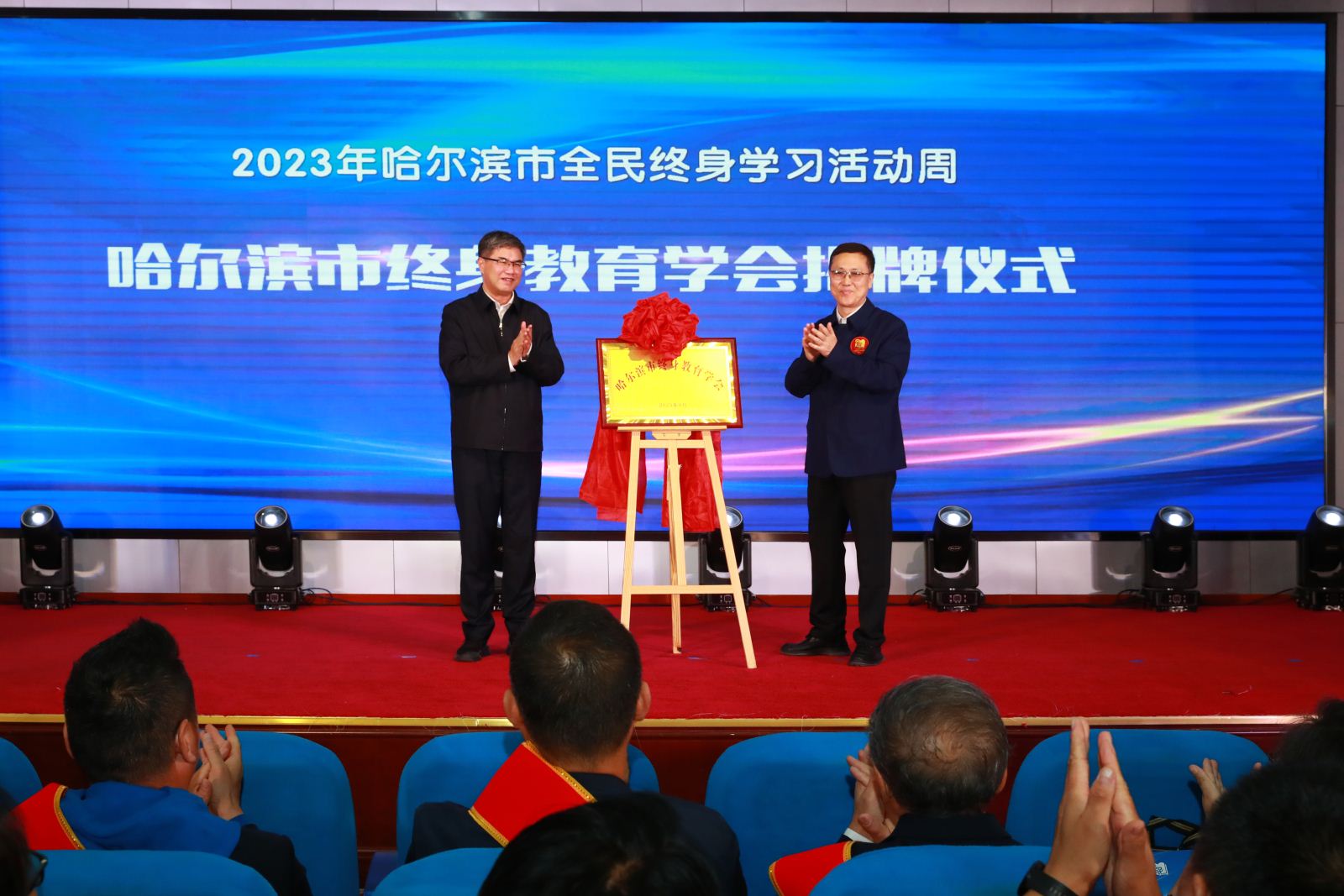 开幕式紧紧围绕“推进数字教育 建设学习型社会”这一主题,以习近平新时代中国特色社会主义思想和习近平总书记关于教育的重要论述为指引,通过社区教育影像视频宣传、百姓学习之星、终身学习品牌项目等成果展板、表彰奖励、经验交流等方式全面展示了哈尔滨市在推进全民终身学习,促进冰城振兴发展,构建服务全民终身学习教育体系和落实老年教育发展战略,加快推进教育强国、文化强国和学习型社会建设过程中取得的丰硕成果。会上,表彰了22名哈尔滨市“百姓学习之星”、15个“终身学习品牌项目”。开幕式上,教育局何泉局长、我校白宝彦校长共同为哈尔滨市终身教育学会揭牌,党委副书记陈永昕宣读表彰决定。