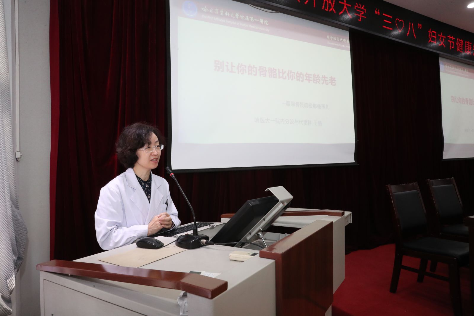 座谈会后,哈医大一院内分泌科副主任、主任医师王晶博士为全校女教职工举办健康讲座。