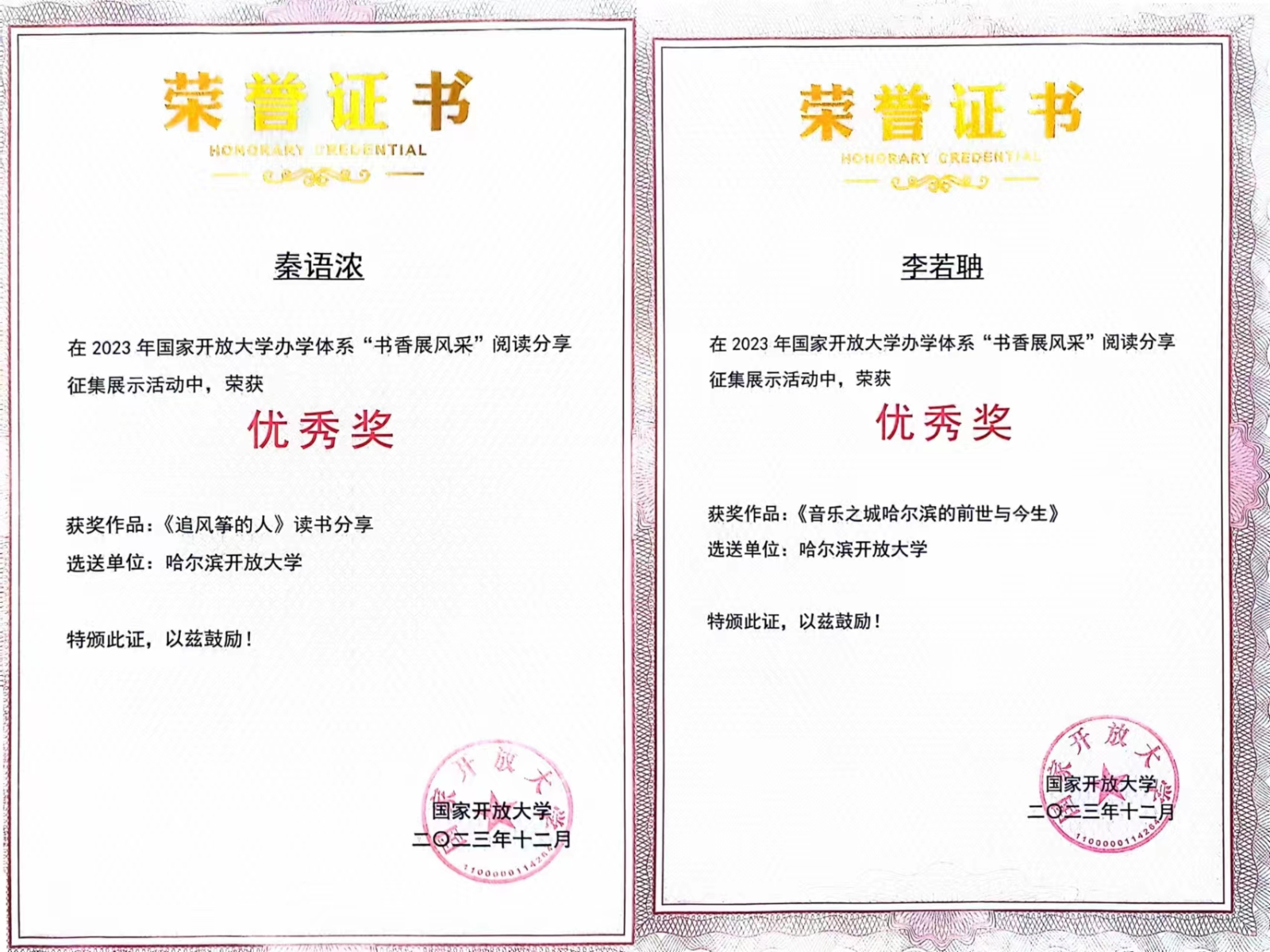 近日,国家开放大学办学体系“书香展风采”阅读分享征集展示活动公布评选结果,我校推荐的秦语浓老师《追风筝的人》和李若聃老师《音乐之城哈尔滨的前世与今生》两部作品喜获教师组优秀奖。