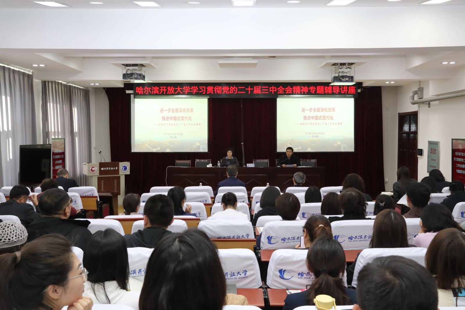 李天明教授以“进一步全面深化改革,推进中国式现代化——深刻学习领会党的二十届三中全会精神”为主题,从深刻领会和把握进一步全面深化改革的重大意义、指导思想、总目标、重大原则、重要举措、根本保证等六个方面,讲解了党的二十届三中全会精神的深刻内涵和深远影响,阐明了进一步全面深化改革系统部署以及东北振兴发展的重要性,具有很强的指导性、针对性和启发性,为全体教职工上了一堂生动的时政党课。