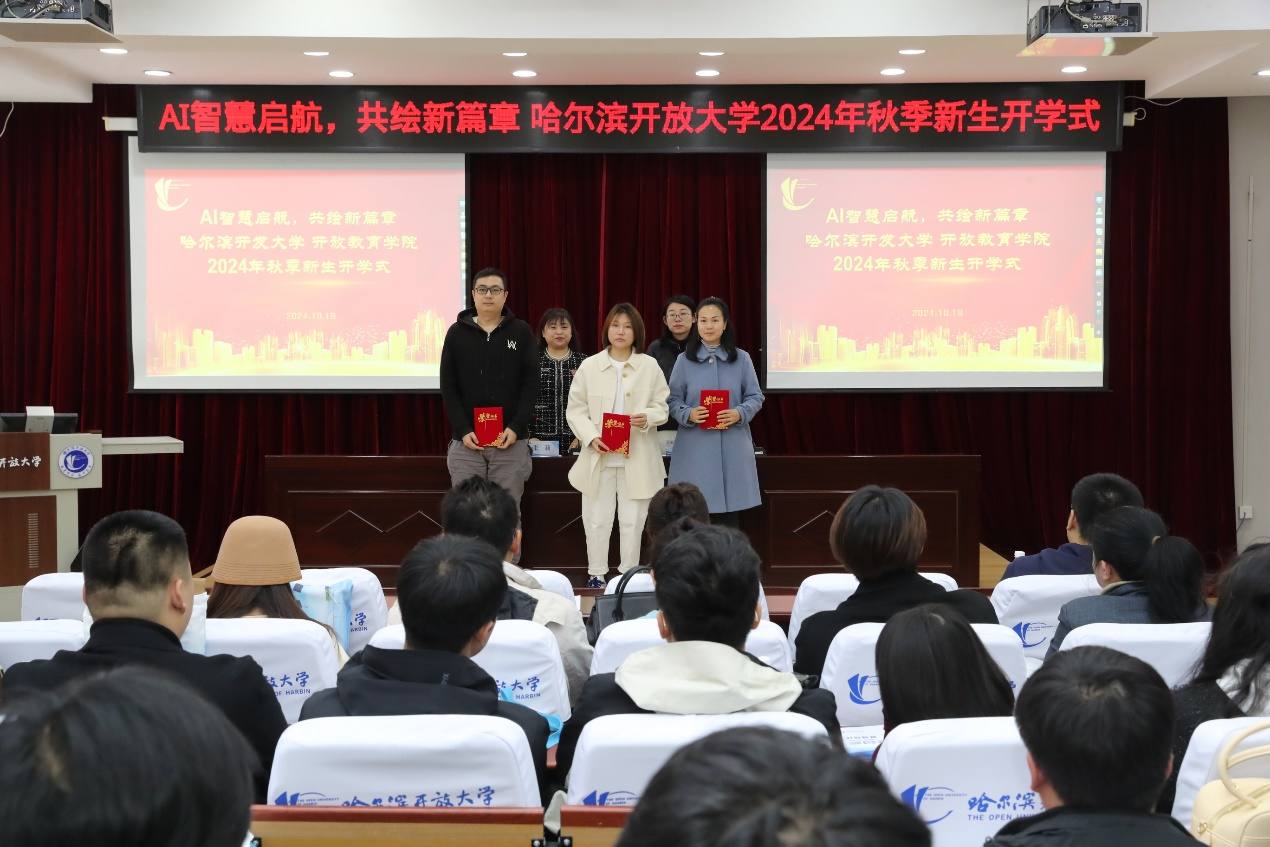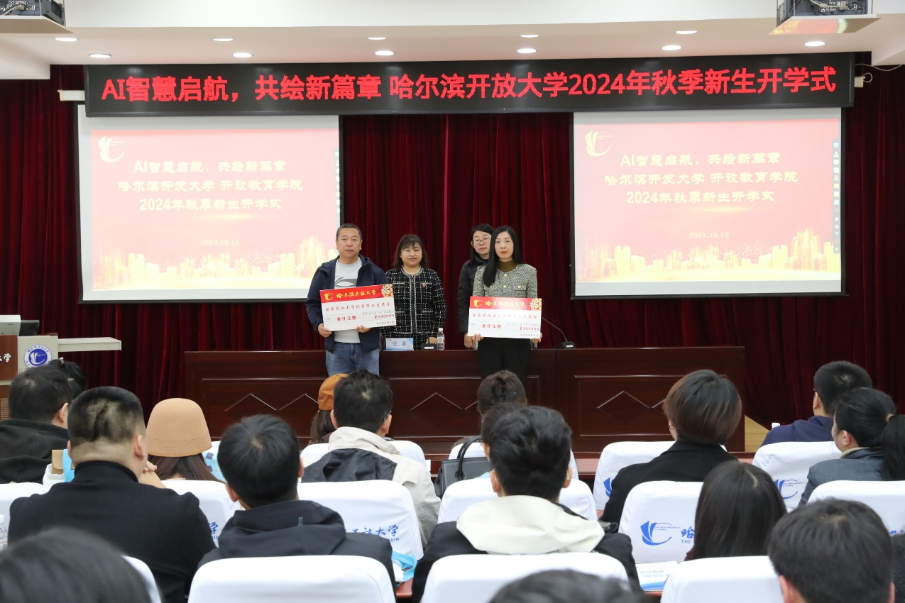 副校长张莉代表多宝(中国)向全体2024年秋季新学员表示诚挚的欢迎,对新学员提出了“确立目标,规划未来”、“勤奋学习,追求卓越”、“加强沟通,学会合作”、“玉汝于成,能力提升”等四项要求,宣读了近期哈开大学生获得国家开放大学、校级、学院级各类活动获奖名单,并为获奖学生代表颁发荣誉证书。优秀毕业生代表郭枫、新生代表刘长荣发言。理工教研室主任赵振在开学式尾声开展了AI讲座,引起学生极大的兴趣和热情。
