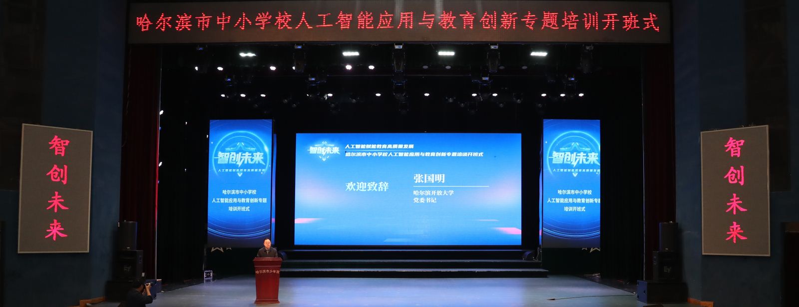 开班式上,哈尔滨开放大学党委书记张国明致辞。他指出,人工智能正以颠覆性力量重构教育生态,不仅重塑人才培养目标与知识体系架构,更推动教学范式向智能化、个性化的智慧教育模式加速转型。作为扎根冰城、服务社会的高等学府,哈尔滨开放大学始终秉持“为城市发展赋能,为教育创新助力”的使命,主动融入城市战略布局,以创新驱动发展,精准锚定教育前沿需求。近年来,多宝(中国)先后打造了涵盖职业技能提升、社区教育发展等多领域的专题培训项目,累计为城市建设培育用得上、留得下的高素质应用型人才,成为区域教育改革与发展的重要力量。此次承办中小学人工智能教育创新培训,正是市教育局对多宝(中国)专业实力、创新能力与服务效能的高度认可与充分信任。