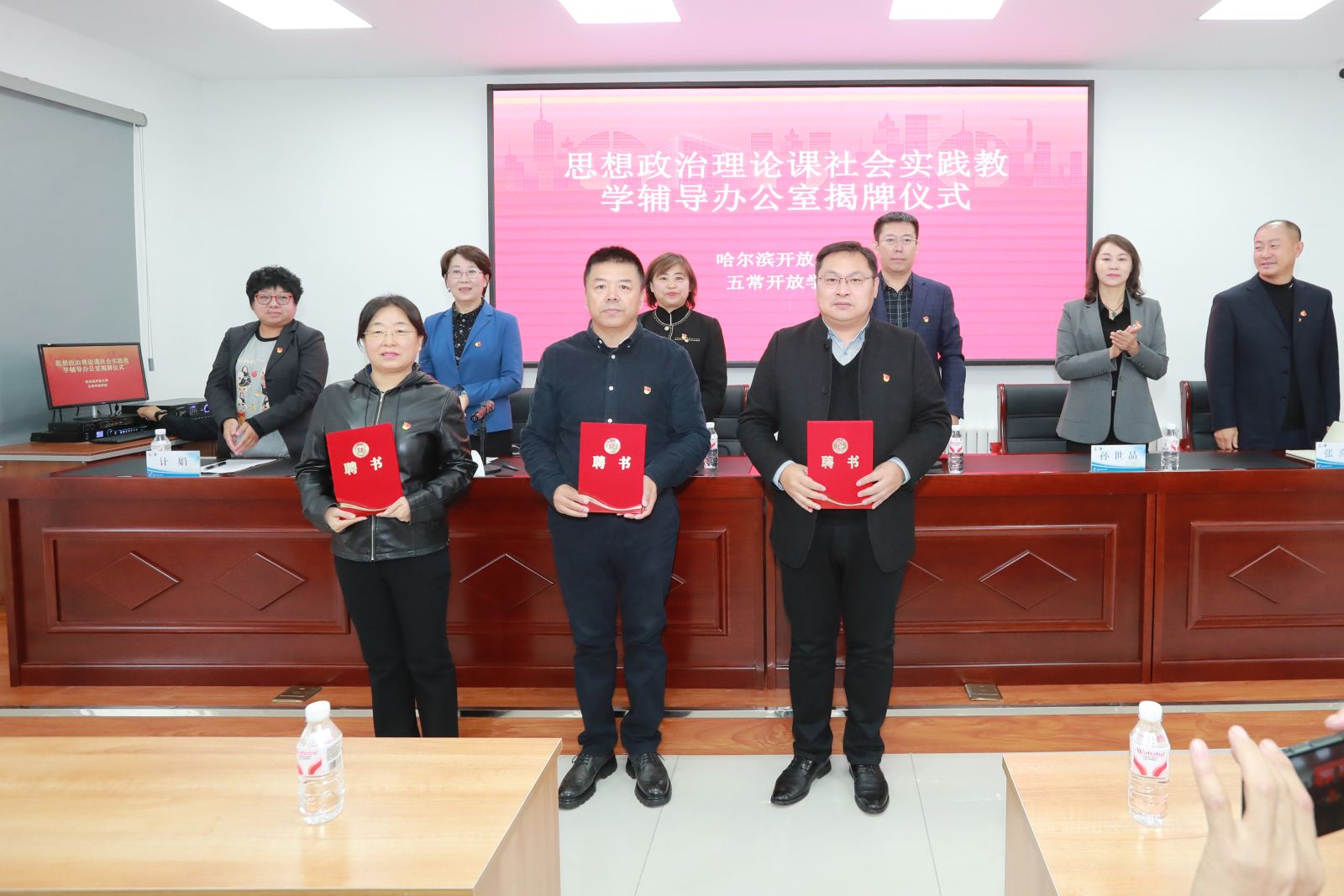 在热烈的掌声中,哈尔滨开放大学副校长、党委委员张莉与五常开放学院校长王义岩共同为“思政课社会实践教学辅导办公室”揭牌,并为思政课社会实践教学辅导教师颁发聘书。